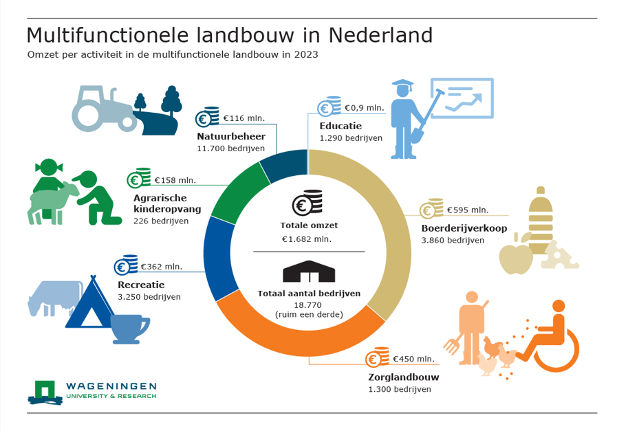 De omzet van de multifunctionele landbouw in Nederland wordt in 2023 geschat op circa 1,68 miljard euro. Dit is flink meer dan in eerdere jaren. Deze groei komt mede door het herstel na Covid-19-pandemie, prijsstijgingen door de hoge de inflatie, de uitbreiding van activiteiten en verdere professionalisering. De boerderijverkoop was in 2023 het grootste segment met een omzet van 595 miljoen euro, gevolgd door zorglandbouw (450 miljoen euro) en recreatie (362 miljoen euro). De agrarische kinderopvang bracht aan omzet 158 miljoen euro op, natuurbeheer 116 miljoen euro en boerderijeducatie slechts 0,9 miljoen euro. Dit blijkt uit recent onderzoek van Wageningen University & Research in de reeks Kijk op multifunctionele landbouw in opdracht van het ministerie van LVVN.