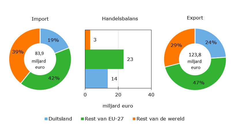 In de totale goederenexport is 52% van Nederlandse makelij en 48% wederuitvoer van buitenlandse makelij. Het handelsoverschot (exportwaarde-importwaarde) van Nederlandse landbouwgoederen bedroeg 39,9 miljard euro. De meeste landbouwexport gaat in 2023, net als in voorgaande jaren, naar onze buurlanden. Van de geraamde totale export gaat bijna een kwart naar Duitsland. Op de tweede plek staat België met 12%. Daarna volgen als belangrijkste afnemers Frankrijk (9%) en het Verenigd Koninkrijk (8%). In 2023 ging van de totale exportwaarde 71% naar EU-27 landen.