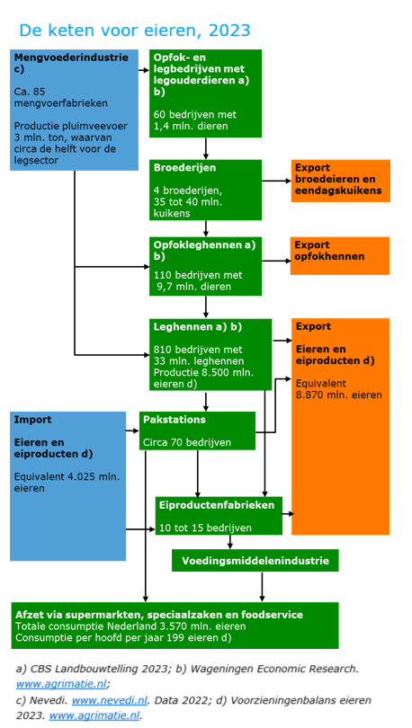 De jonge hennen gaan van de opfokbedrijven naar het leghennenbedrijf. In deze schakel worden eieren geproduceerd op 810 bedrijven met 33 miljoen leghennen. De eieren worden gesorteerd en verpakt in pakstations en een deel van de eieren (25 tot 30%) wordt verwerkt tot eiproduct dat gebruikt wordt als ingrediënt in de voedingsmiddelenindustrie. Producten met veel eiproduct zijn sauzen/mayonaise, banket en pasta. Zoals de figuur aangeeft is er op elk niveau in de keten export. Broederijen exporteren broedeieren, eendagskuikens en jonge hennen, pakstations exporteren een groot deel van de eieren en voor de eiproductenindustrie is de export van eiproduct (vloeibaar of gedroogd product) belangrijk.