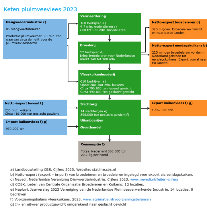 Productieketen De keten voor de productie van pluimveevlees kent een aantal opeenvolgende schakels. Elke schakel is gespecialiseerd in het voortbrengen van een product dat geleverd wordt aan de volgende schakel. De figuur geeft de opbouw van de keten van pluimveevlees. De keten begint met de vermeerdering. Dit zijn bedrijven met ouderdieren die broedeieren produceren. Op 160 bedrijven worden in totaal 4,7 miljoen ouderdieren gehouden. In de volgende schakel, de kuikenbroederij, worden de broedeieren uitgebroed tot eendagskuikens. Vervolgens worden de eendagskuikens geleverd aan de vleeskuikenhouders. Op de vleeskuikenbedrijven worden, in een periode van 6 tot 8 weken, vleeskuikens gehouden tot een eindgewicht van 2,0 tot 3,0 kg. De kuikens worden vervolgens geleverd aan een slachterij. In Nederland worden in 14 slachterijen vleeskuikens geslacht met een totale productie van 895.000 ton geslacht gewicht. Een belangrijk deel van de aanvoer van de Nederlandse slachterijen betreft vleeskuikens uit Duitsland en, in mindere mate, België.